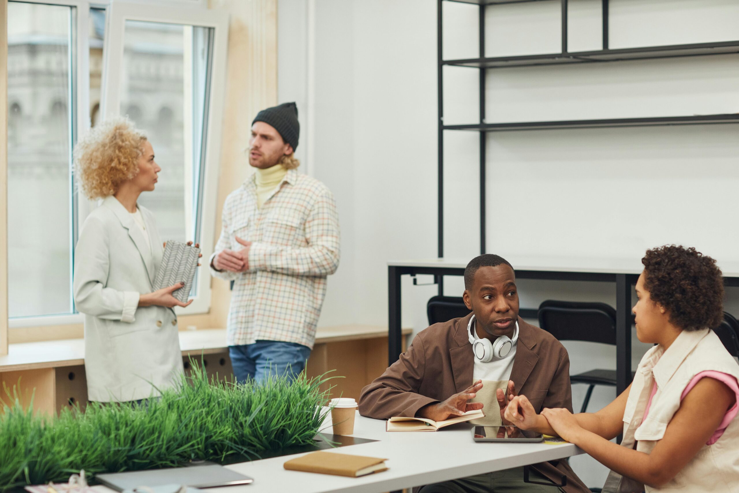 - The office features cultural influences and ergonomic furniture.